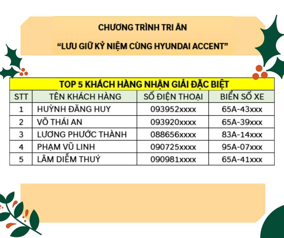 Chương trình Tri ân Khách hàng “LƯU GIỮ KỶ NIỆM CÙNG HYUNDAI ACCENT” dành riêng cho các Khách Hàng sử dụng dòng xe Hyundai ACCENT đã khép lại. Cảm ơn Quý khách hàng đã tham gia chương trình.
