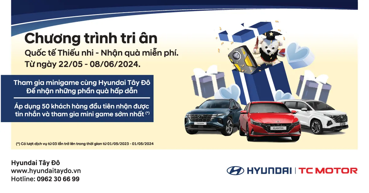 Quý Khách Hàng đang sử dụng xe du lịch Hyundai có tối thiểu 3 lượt sử dụng dịch vụ trở lên trong vòng 12 tháng tại Hyundai Tây Đô (Từ ngày 01/05/2023 đến 01/05/2024) & có nhận được tin nhắn đính kèm đường link tham gia chương trình từ Hyundai Tây Đô.